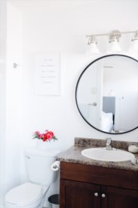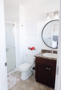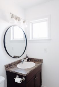 We took a few pieces that we knew we could change on our own and switched those out including a new toilet, shower head, mirror and vanity light. All thanks to Lamps Plus for helping us out with the two, black round vanity mirror and vanity light! It was a lot of trial and error and a lot of youtube videos but Drew and I managed to get it done. For anyone newbies with home renos you will know exactly how we’re feeling here!