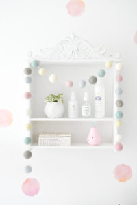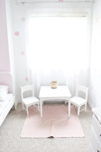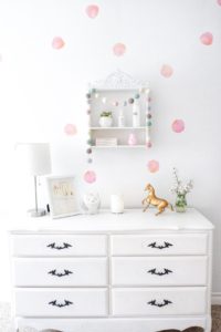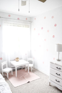 I was really excited to work with a couple shops to make this small & pretty change happen. We picked out the Watercolor Polka Dots from Urban Walls & General Paint Swiss Rose. Both accent each other very beautifully. It’s a very soft, girly style and I’m excited that I went full in on the pink. I’ve lighten the touches of gold and gave more white accents to soften it even more! For a smaller room the lighter colours defiantly open the space up for her to create a more playful atmosphere!