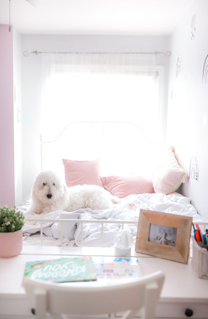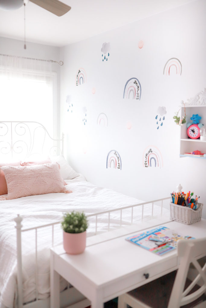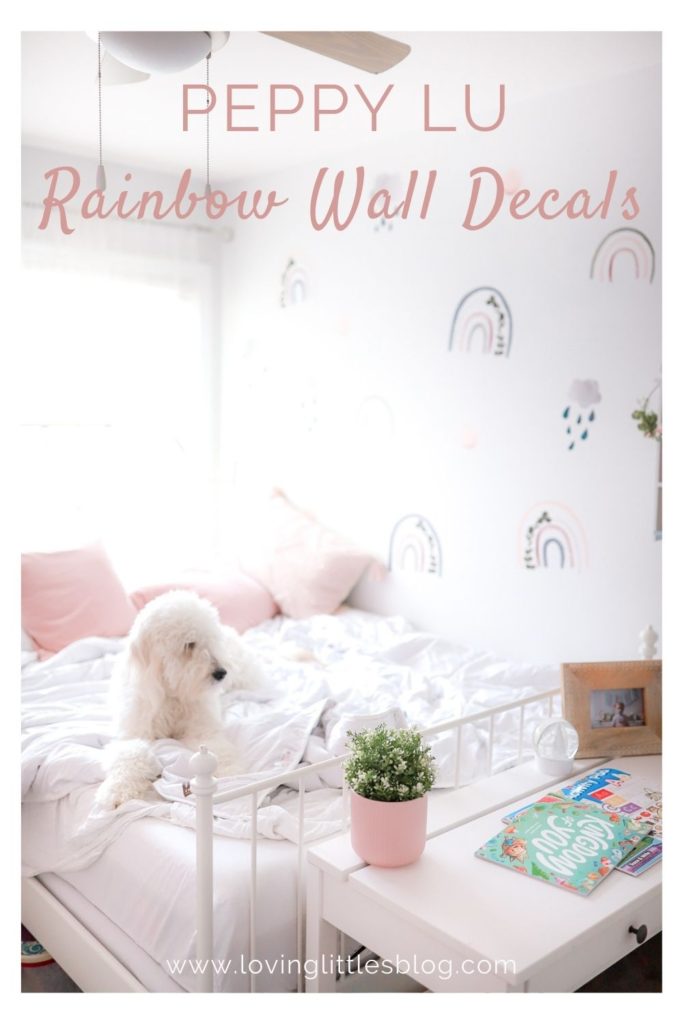 Peppy Lu has many other cute wall decal sets to choose from all coming from her own creative thoughts, Sarah works very hard curating a solid collection of decals you’ll love and your kids will love! The rainbows come in different sizes, so depending the space of your wall and which area your going with you’ll find small, medium and large rainbows to choose from! We do have the large considering the size of this what was boring wall.