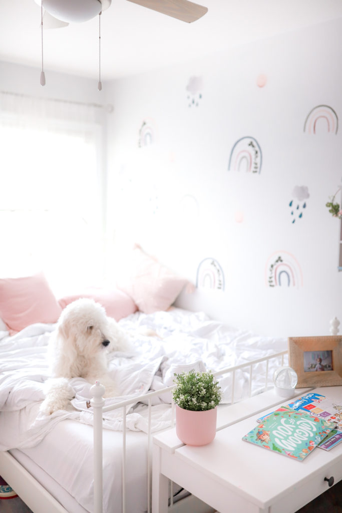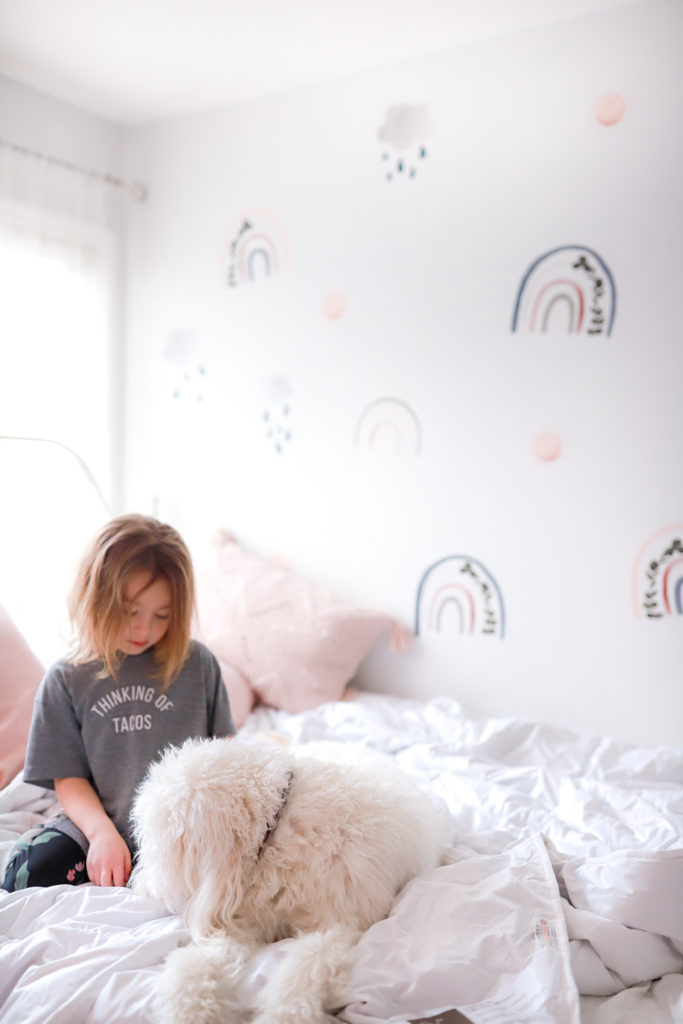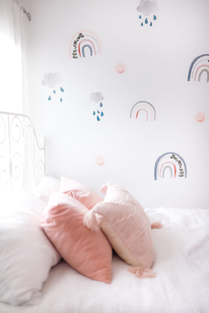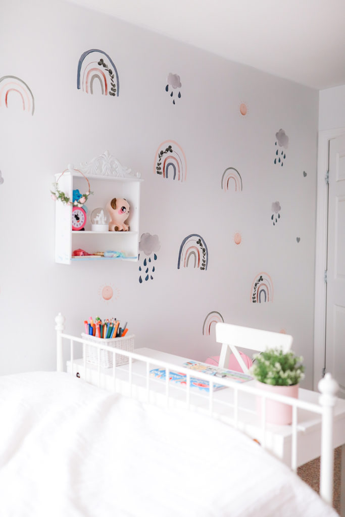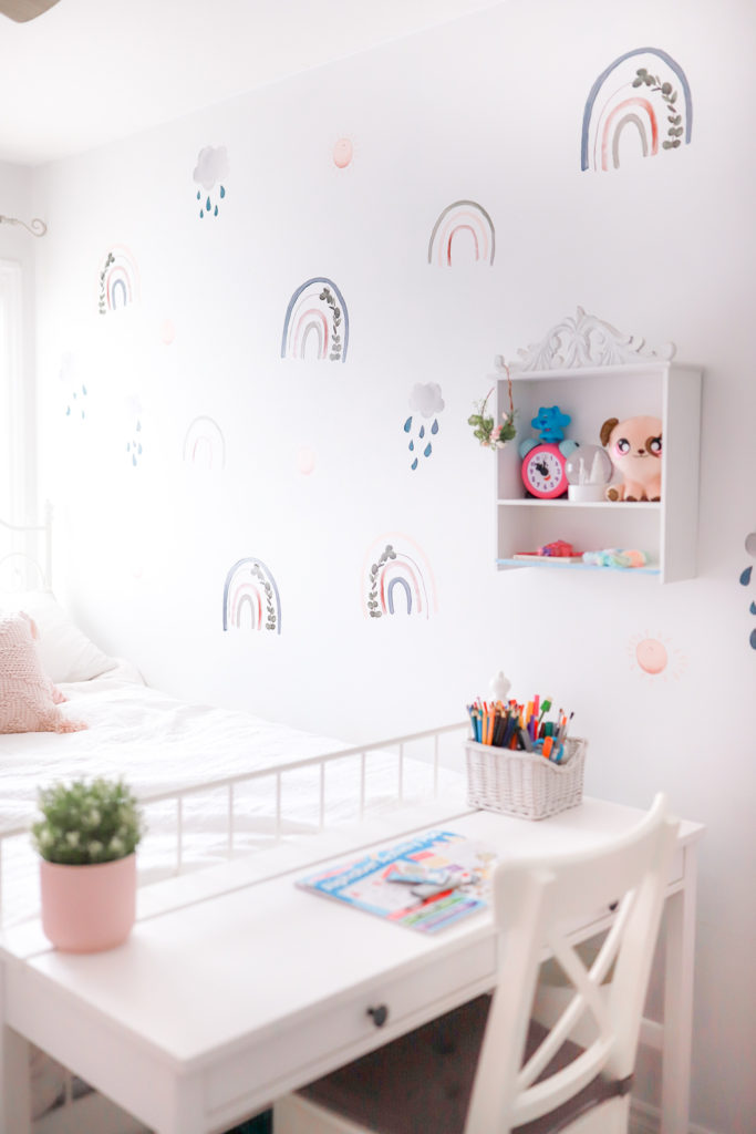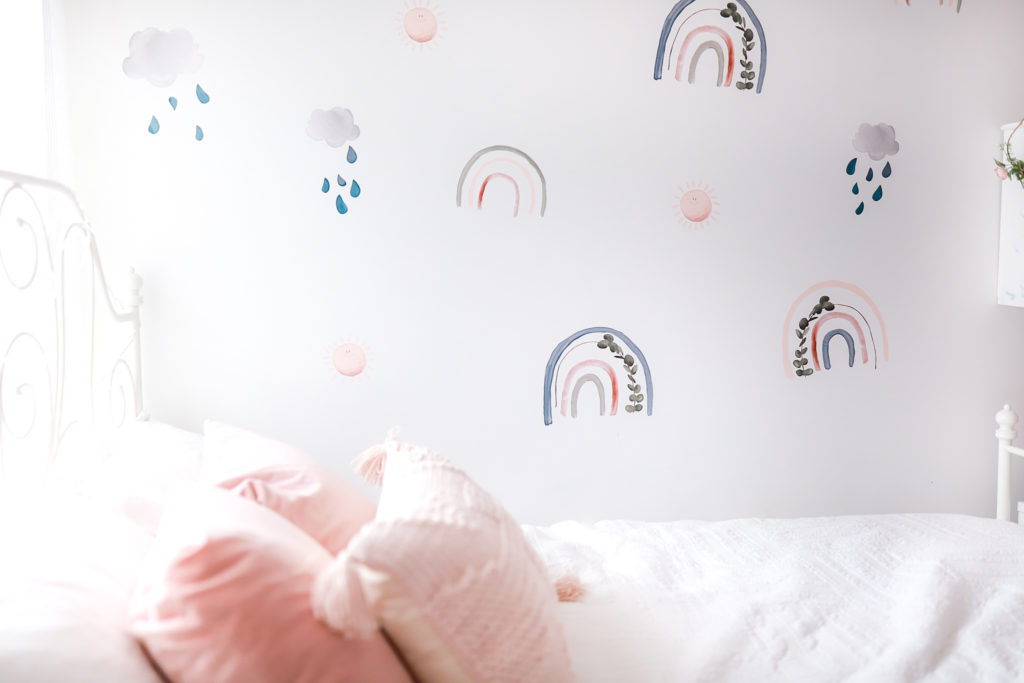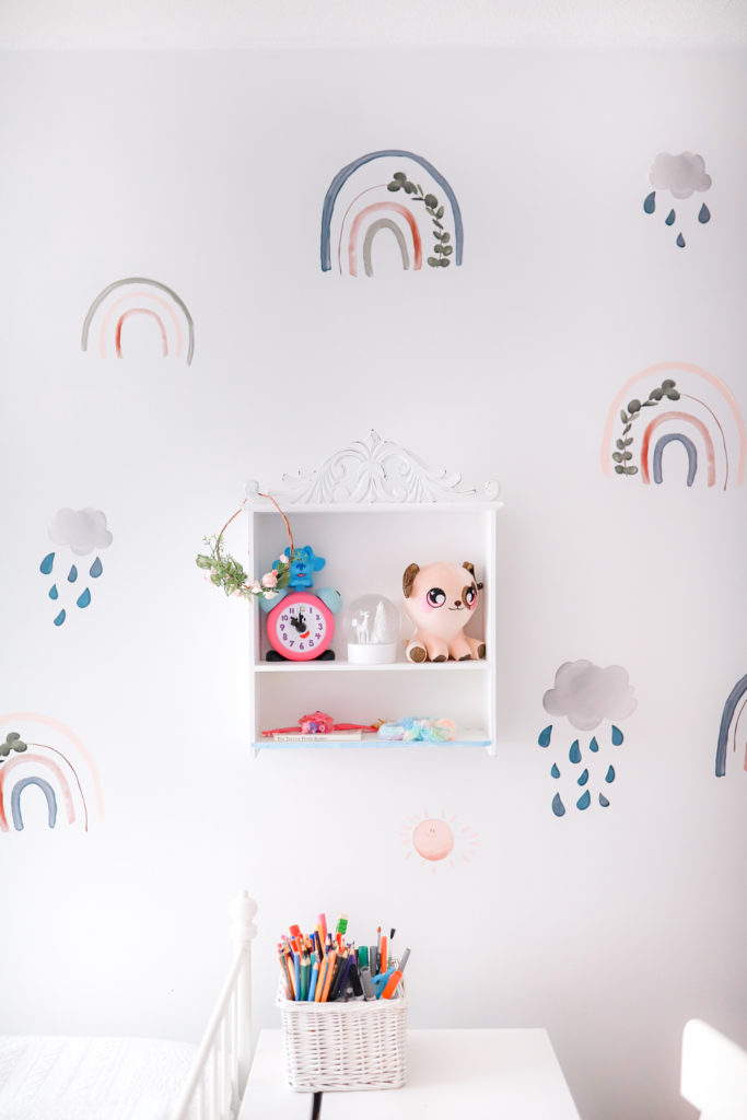 We just recently changed up Ellas giant wall. She was feeling a fun change, so we went from polka dots to these really cute Rainbow Wall Decals from Peppy Lu. With little smiling sunshines and clouds with rainbow drops. They’re really the sweetest looking wall decals. With lots of bright fun colours and eucalyptus leaves in the rainbows giving a subtle touch.