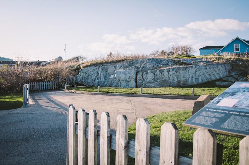 Fishing is one of the most dangerous jobs and to tribute those lost at sea. William E. Degarthe carved a monument to the Nova Scotia fisherman. On a 30 metre long rock it’s carved with 32 fisherman, their wives and children with the Nova Scotia seascape.